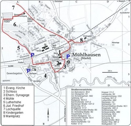 Von hier geht es zunächst kurz zur Evang.-luth. Kirche „Maria Kilian“ (1), bevor Sie der Weg auf der anderen Straßenseite am Schloss (2) und der ehemalige Synagoge (3) vorbeiführt. Sie passieren die Mühle (4) und die Lutherhöhe (5) und gelangen zum Jüdischen Friedhof (6). Vorbei an der neu gefassten Lochquelle (7) bringt Sie der Weg zum Kindergarten (8) und wieder in Richtung Zentrum (9).